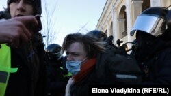 Митинг 27 февраля практически сразу начался с задержаний – полицейские забирали в автозаки любого, кто разворачивал плакаты. К полицейским попадали и те, кто просто стоял в толпе, скандировал лозунги или хлопал. Задержания были жесткими: людей вырывали из толпы, одному из мужчин порвали джинсы, другому участнику акции – Глебу Тарасову – при задержании сломали нос.